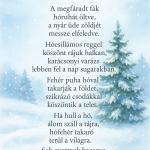 Ha hull a hó A megfáradt fák hóruhát öltve, a nyár üde zöldjét messze elfeledve. Hócsillámos reggelköszönt rájuk halkan, karácsonyi varázslebben fel a nap sugarakban. Fehér puha hóval takarják a földet, szikrázó csodákkal köszöntik a telet. Ha hull a hó, álom száll a tájra, hófehér takaró terül a világra, Sok gyermek kacagva játszik a hóban, […]