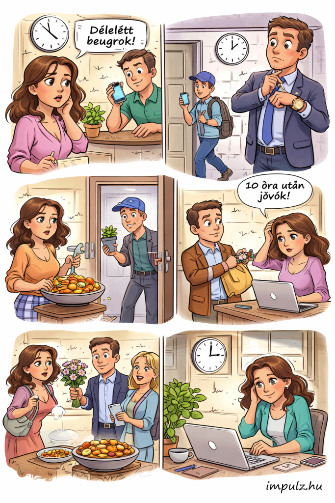 - Szerviz vagy házhoz jövő szolgáltatás: Ha a szerelő csak annyit mond, „délután beugrok”, te egész délután nem tervezhetsz semmit, és végül 5-kor érkezik, amikor már minden más elfoglalt.