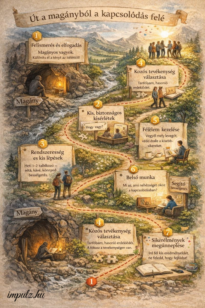 A magány gyakran nem az emberek hiányát jelenti, hanem az érzelmi kapcsolódás hiányát. Egy-két őszinte, biztonságos kapcsolat sokkal többet ér, mint sok felszínes ismeretség. Már kis lépések is számítanak: valakivel rendszeresen beszélni, időről időre találkozni, vagy megosztani azt, hogyan érzed magad.