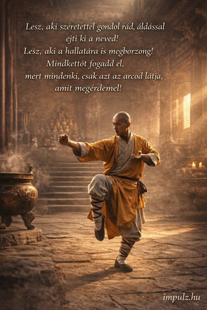 Az élet során mindannyian megtapasztaljuk, hogy ugyanaz a jelenlét másokban egészen eltérő érzéseket vált ki. Van, aki melegséggel és szeretettel gondol ránk, és van, akiben pusztán a nevünk hallatán is feszültség ébred. Ez a kettősség nem hiba, hanem az emberi kapcsolatok természetes velejárója. A bölcsesség ott kezdődik, amikor nem akarjuk mindenáron irányítani mások véleményét. A belső egyensúly abból fakad, hogy elfogadjuk: nem minden visszajelzés rólunk szól, sokszor a másik belső világát tükrözi. A képen megjelenő harcművész nyugalma ezt az elfogadást sugározza. Mozdulataiban erő és fegyelem van, mégis csendes béke árad belőle. A környezet, az ősi tér és a meleg fények az időtlenséget idézik. Ez az üzenet nem harcra hív, hanem tudatosságra. Arra emlékeztet, hogy az önazonosság fontosabb, mint a külső elismerés.