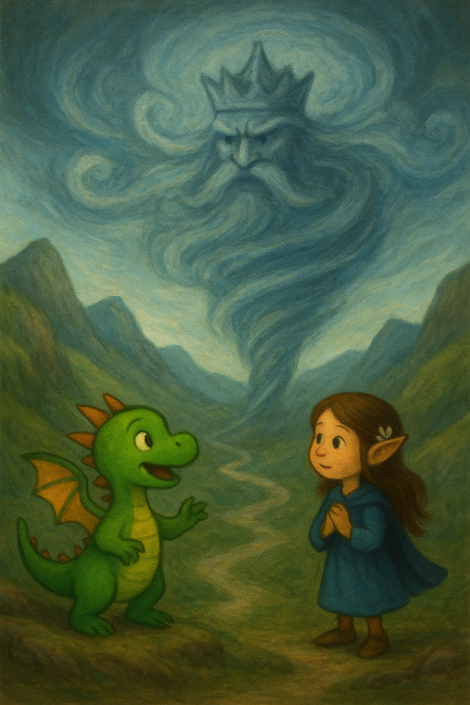 Nemsokára egy hegytetőre értek, ahol a földet vastag, cirkáló szelek takarták, mintha ezernyi ezüst kígyó tekeredne a kövek között. A közepén pedig hatalmas forgószél emelkedett, és abból formálódott meg a Szél Királya.
