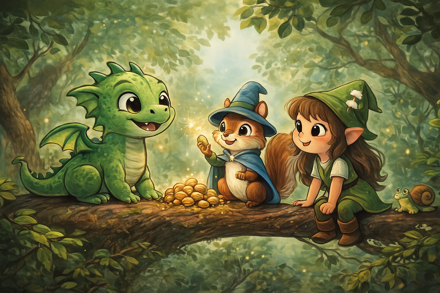 Egy derűs reggelen Hablaty, a kis sárkány, és Nyafi, a kis kobold lány, egy széles faágon üldögélve falatozták a reggelijüket. A nap melegen sütött át a lombok között, és úgy tűnt, minden békés a Szivárványvölgyben.