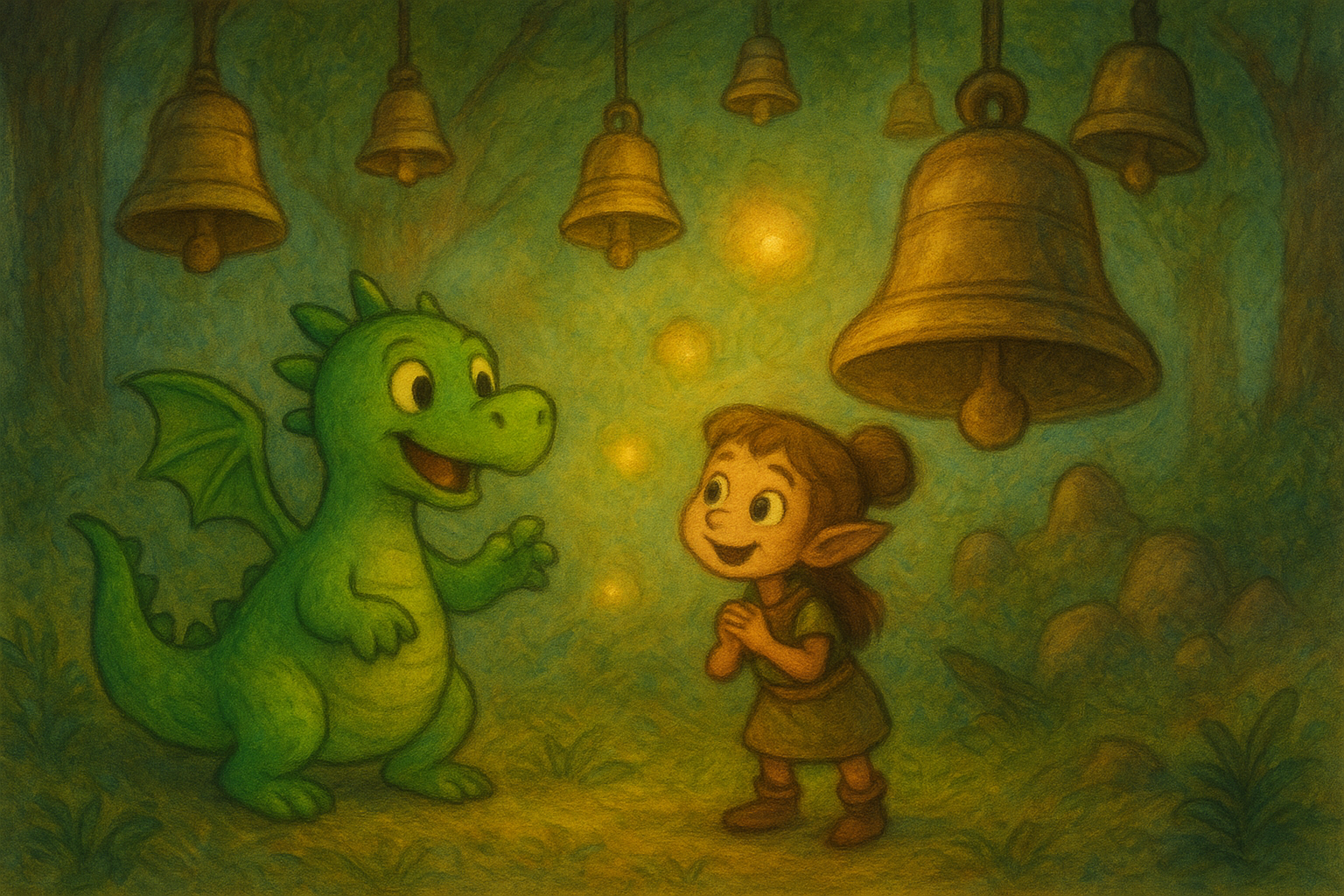 Ahogy felértek a hegy aljához, mindenütt apró harangok lógtak a fákon. Minden szellőre csengettyűk szóltak, mintha maga a szél játszana rajtuk.