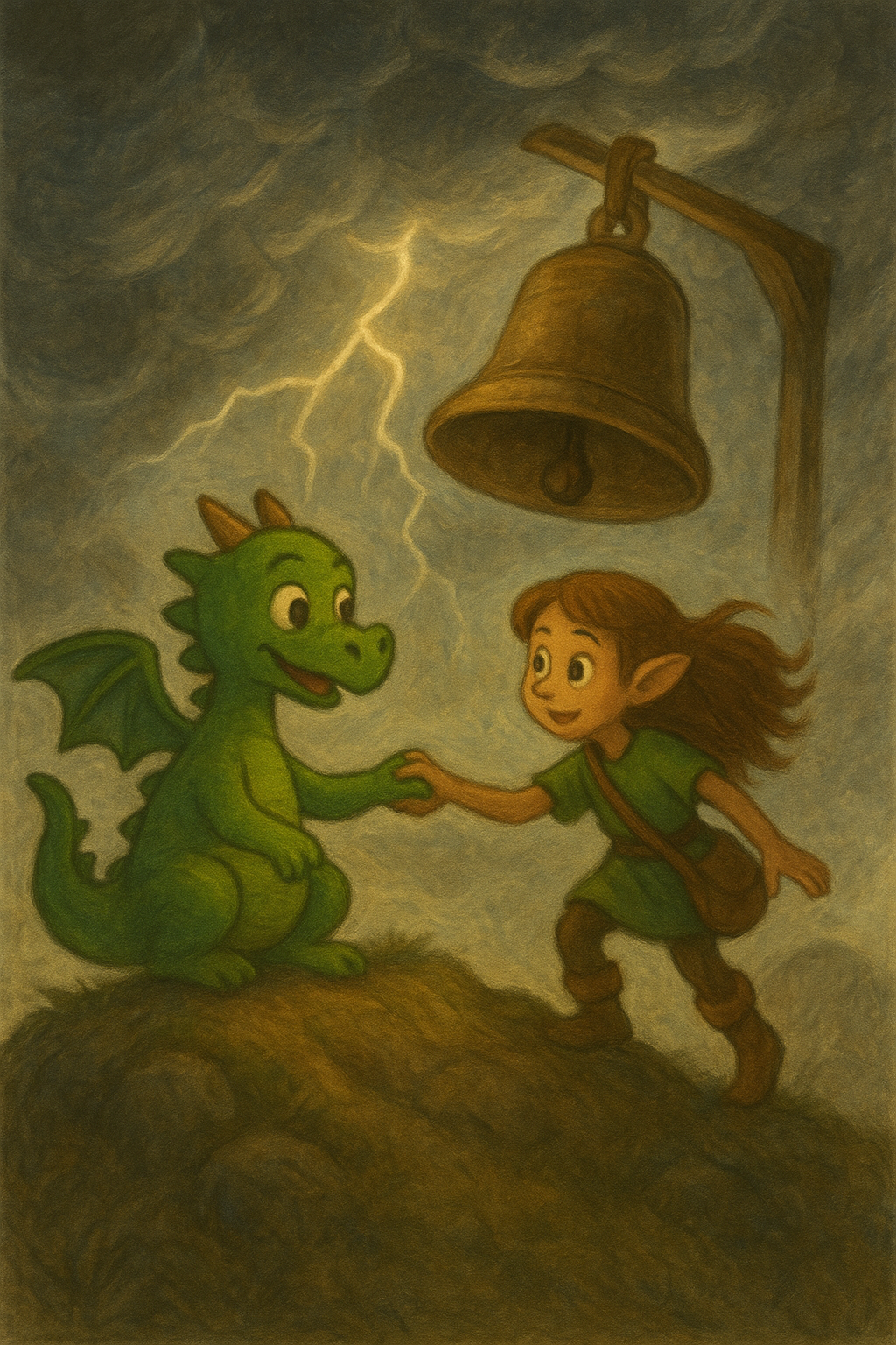 Ahogy közeledtek, a szél egyre erősebben fújt, és a felhők között megpillantották a harangot. Tényleg ott lebegett és minden dörgésre hatalmasan megkondult.